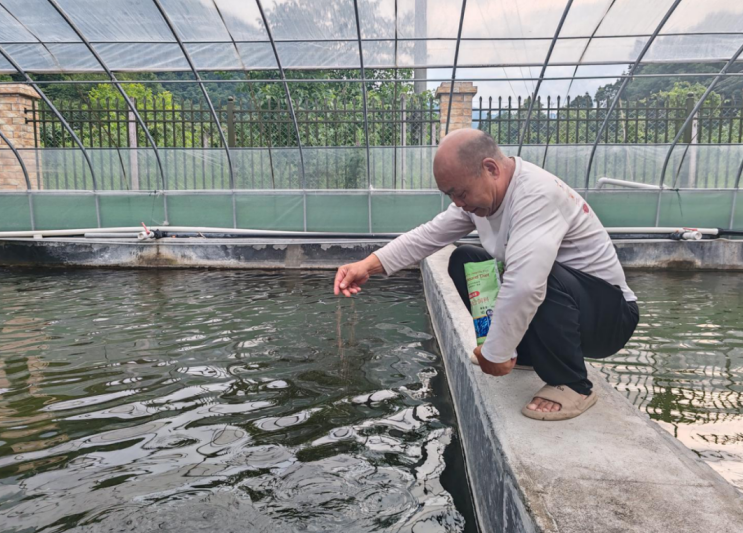 养殖场师傅进行投喂鱼饲料 闫冉摄