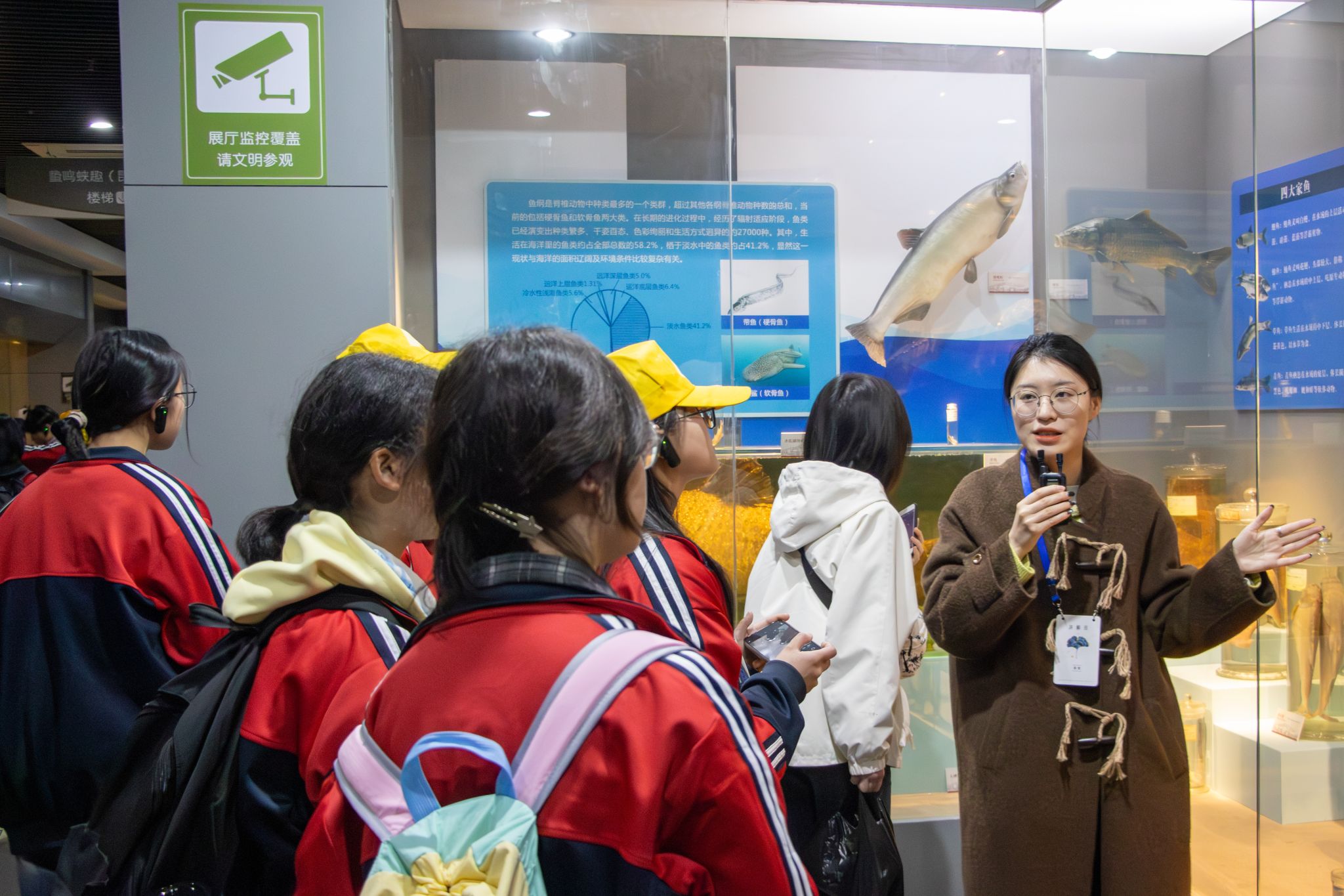 师生一行来到博物馆,参观丰富多样的自然藏品,近距离感受自然生命的风采和魅力。同学们认真观看标本,驻足讨论。在“温驯家园”展区展出的湖北白猪标本旁,讲解员胡煜为同学们介绍了我国养猪学界首位院士熊远著先生带领团队进行的瘦肉型白猪研究,同学们详细了解了培育我国首个母本瘦肉型猪的艰辛历程。