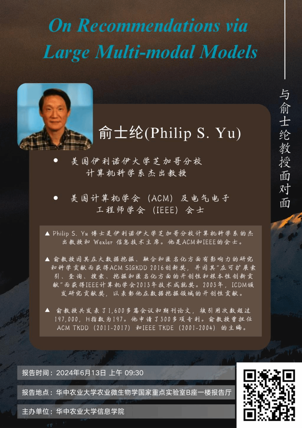 ▲俞教授共发表1,600多篇会议和期刊论文,被引用次数超过197,000,H指数为197。申请300多项专利。俞教授曾担任ACM TKDD (2011-2017) 和IEEE TKDE (2001-2004) 主编。