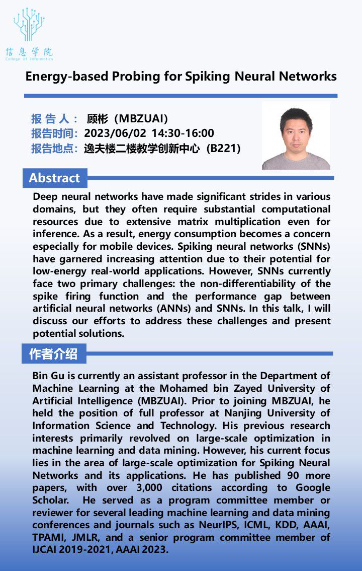 Bin Gu is currently an assistant professor in the Department of Machine Learning at the Mohamed bin Zayed University of Artificial Intelligence (MBZUAI). Prior to joining MBZUAI, he held the position of full professor at Nanjing University of Information Science and Technology. His previous research interests primarily revolved on large-scale optimization in machine learning and data mining. However, his current focus lies in the area of large-scale optimization for Spiking Neural Networks and its applications. He has published 90 more papers, with over 3,000 citations according to Google Scholar. He served as a program committee member or reviewer for several leading machine learning and data mining conferences and journals such as NeurIPS, ICML, KDD, AAAI, TPAMI, JMLR, and a senior program committee member of IJCAI 2019-2021, AAAI 2023.