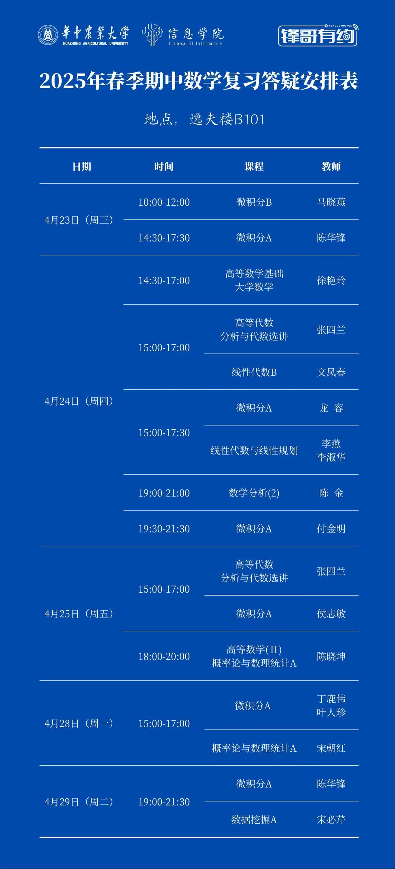 “锋哥有约”之2025年春季期中数学复习答疑安排