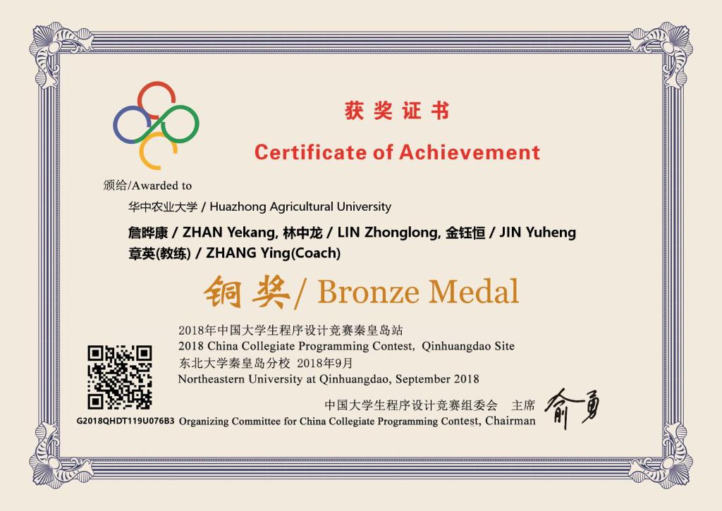 2018年ACM国际大学生程序设计竞赛亚洲区域赛秦皇岛站——铜奖