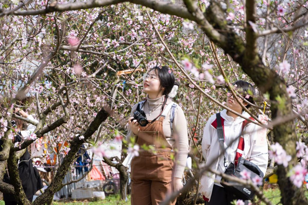 不少得知活动消息的数学爱好者们专程来到这里,来自计科2201班的肖依彤和计科2202班的蒙韦思便是其中的成员。她们穿梭在桃花林间,踩着落英缤纷的泥土,一边品赏桃花,定格美好瞬间,一边探讨数学字谜的奥秘,她们说:“在春日里邂逅数学的趣味,何尝不是一种浪漫。”