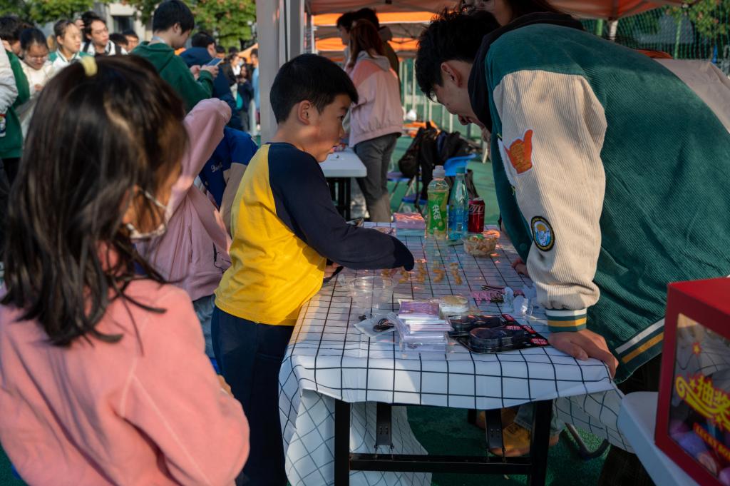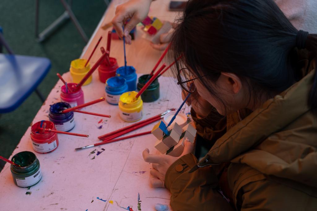 不同于其它体验点,“数学与色彩的邂逅”项目体验点略显“安静”。同学们或拿着蘸满颜料的画笔描涂木块搭成的建筑,或握着晶润的水彩笔涂画纸上的建筑,专心致志地思考“四色难题”,斟酌如何不让相同的颜色邻近。完成挑战后,来自外校的陈永倩说:“我一下子就被这项活动吸引了,它将数学与艺术巧妙融合,让人沉浸式感受到了生活中的数学之美。”