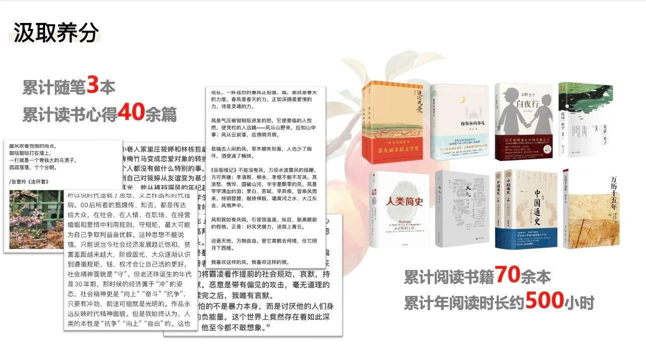 “书籍是我不断前进的力量源泉,使我始终保持着对未知的渴望和追求,在漫长的学术征程中,不断地走下去。”在李嘉弈的大学四年里,书籍是重要的组成部分,每一本书、每一段文字,都使她不断拓展视野,丰富内涵。