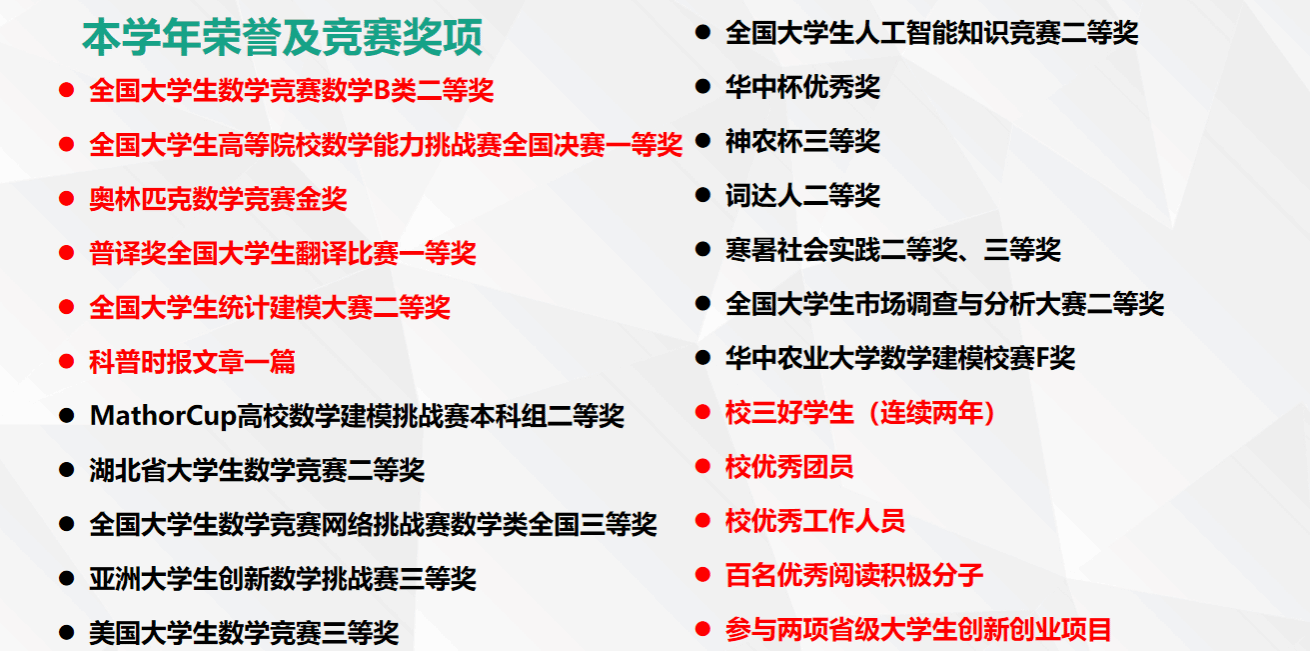 在大二学年,黄一丹刻苦学习,17门课程达到满绩,绩点成绩位列于专业第一,在学好课内知识之余,黄一丹积极参加各类竞赛锻炼自己的知识应用能力。他参加了许多竞赛,获得了一系列奖项,同时他还参与了两项省创,目前正在撰写SCI论文和申请专利。