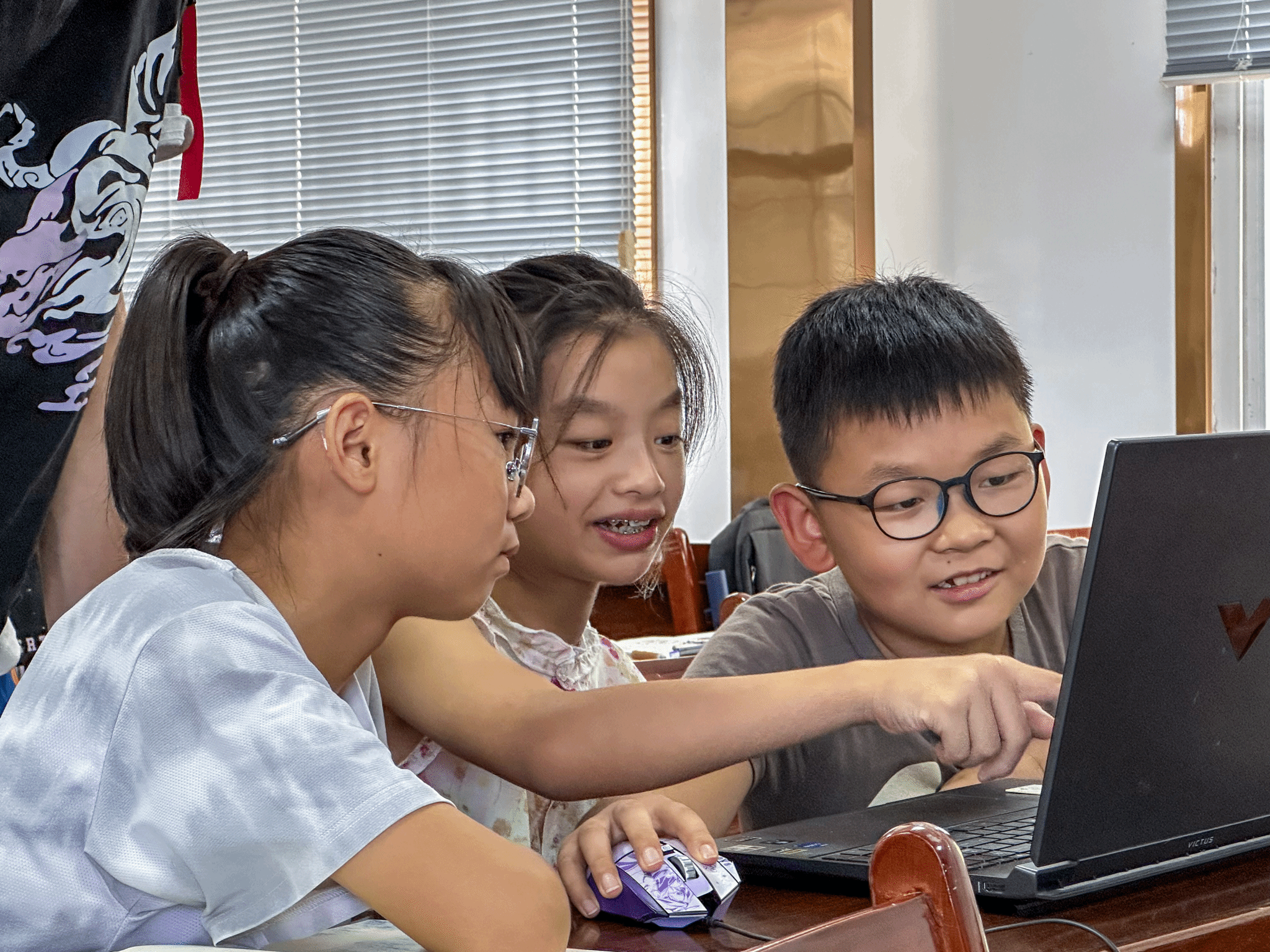 “CPU是电脑中最聪明的部分,它像一个跑步很快的运动员,需要在短时间内完成很多任务!”负责硬件学习组的志愿者巧妙地运用比喻、拟人等修辞手法,将晦涩难懂的计算机知识与日常生活中的现象结合,引得孩子们频频点头。在讲解完毕后,志愿者还与孩子们进行了趣味问答,不仅培养了孩子们的思考能力,还对他们的学习成果进行了检测。