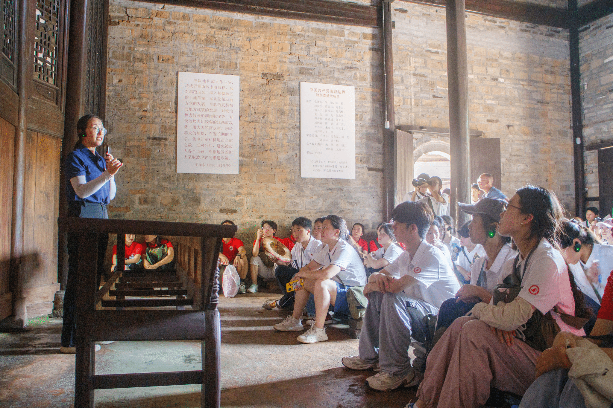 队员们怀着崇敬的心情走进茅坪八角楼毛主席旧居,轮流登上阁楼,屋内陈设简陋古朴,毛泽东和贺子珍的画像下是一方桌案,抬头便能望见八角形天窗,阳光洒下照亮整片阁楼。跟随着讲解员的步伐,成员们参观了红四军士兵委员会旧址,墙壁上的标语“消减屠杀农工的国民党”“消减新旧军阀战争”仍然清晰可见。在中国共产党湘赣边界第一次代表大会会堂,聆听讲解员讲述当年革命故事,仿佛身临其境地感受到那段艰苦卓绝的革命岁月。