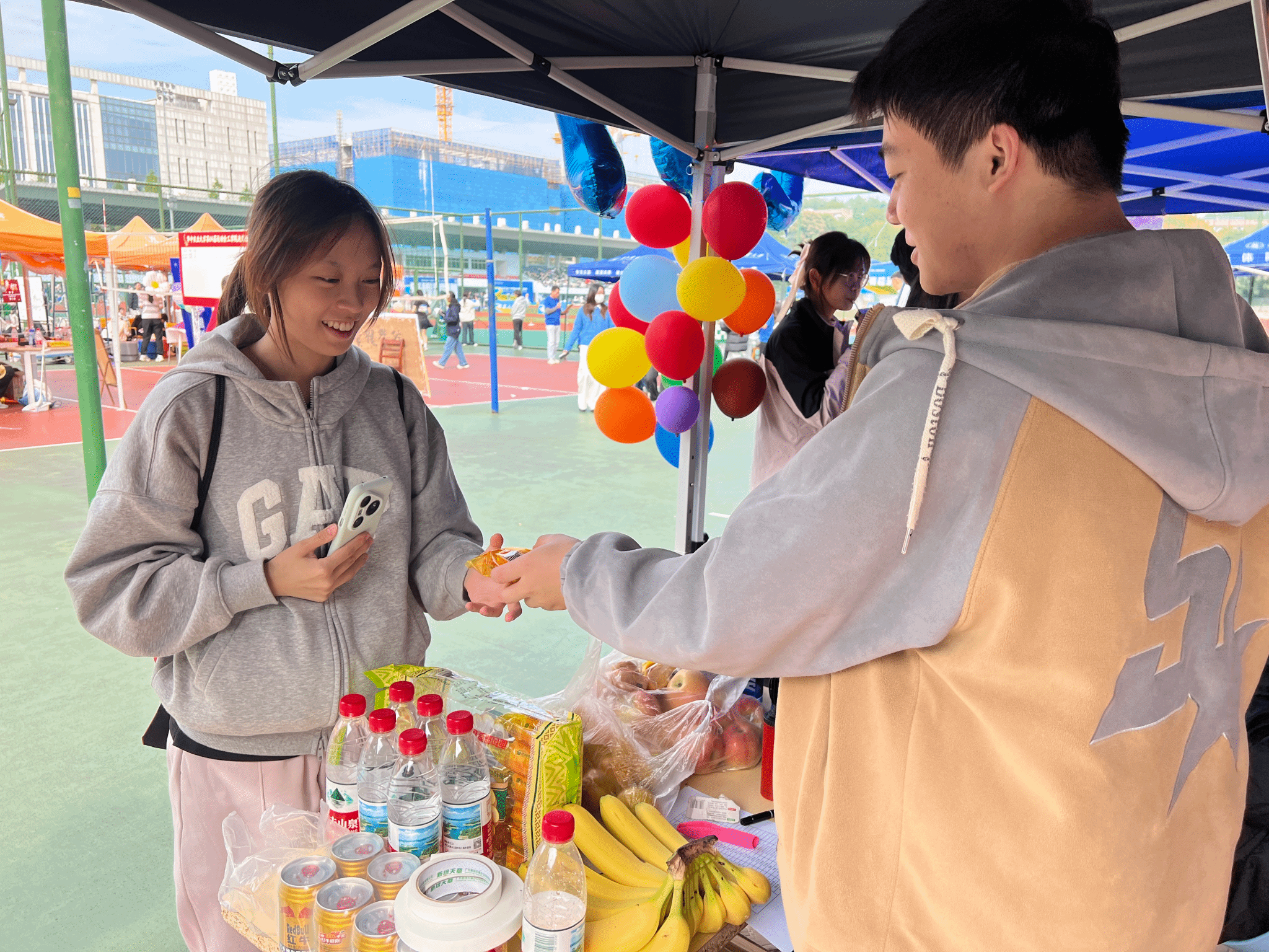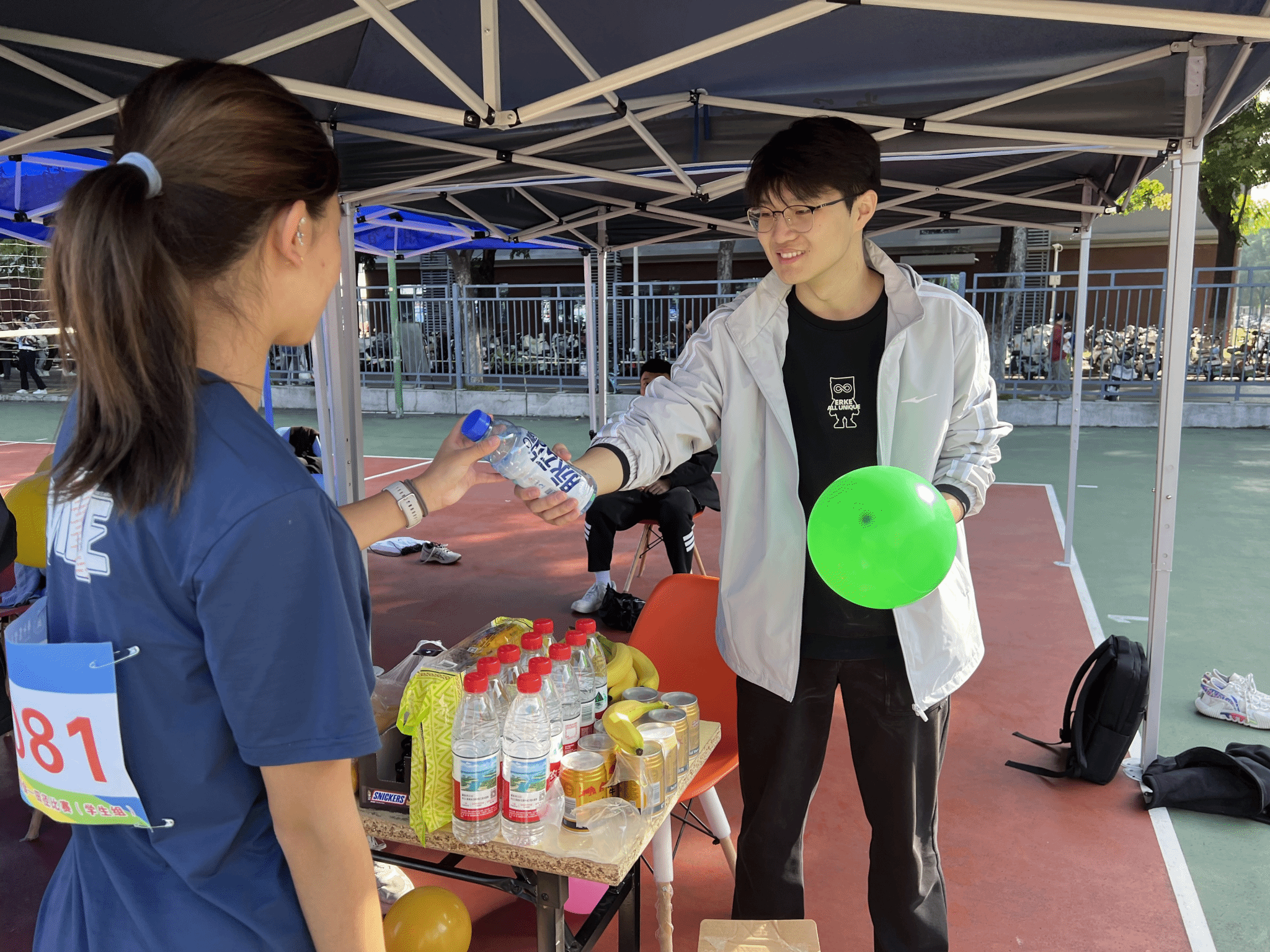 运动会期间,后勤团队的身影每天清晨便出现在场地。天刚蒙蒙亮,成员们就忙着卸货、分类、摆放,将矿泉水、能量饮料按饮用频率分区域陈列,把水果洗净装盒、食物按种类整理,确保运动员赛后能第一时间找到所需补给。“刚跑完 800 米,喉咙又干又痒,一过来就拿到冰镇矿泉水,太舒服了!” 完成项目的运动员信息2403班王金洋接过水时,脸上满是感激。面对不同需求,后勤人员总能及时响应:看到投掷项目运动员结束比赛,会主动递上牛肉干补充能量;察觉长跑运动员腿部酸痛,会提醒他们吃根香蕉缓解疲劳,耐心的讲解与贴心的举动,让赛场多了份温情。